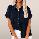 Denne blouse har en løs pasform, der er ideel til varme dage. Den klassiske krave og knaplukningen tilføjer et elegant præg. Perfekt til et afslappet eller professionelt look.