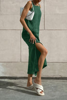 Αυτό το μακρύ φόρεμα γοητεύει με τον μινιμαλιστικό του στυλ και την ρευστή του πτώση που αναδεικνύει τη σιλουέτα φυσικά. Η καθαρή του γραμμή και οι διακριτικές πλευρικές σχισμές το καθιστούν ένα τέλειο κομμάτι για να συνδυάσετε άνεση και εκλεπτυσμένο στυλ. Ελαφρύ και ευχάριστο στη φορά, προσαρμόζεται εξίσου καλά σε ηλιόλουστες μέρες και σε στιγμές χαλάρωσης στις διακοπές.
