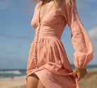 Αυτή η μακριά φόρεμα με V λαιμόκοψη ενσωματώνει το μποχέμ πνεύμα με την ροή της και τη θηλυκή της γραμμή. Η λαιμόκοψη τονίζει διακριτικά τη σιλουέτα, ενώ οι ποικιλία χρωμάτων της επιτρέπει να προσαρμοστεί σε όλες τις επιθυμίες. Μια τέλεια επιλογή για ηλιόλουστες μέρες ή χαλαρές βραδιές.