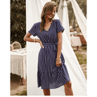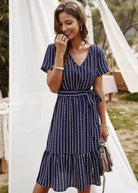 Με τη ναυτική μπλε απόχρωση της, το V-λαιμόκοψη και τη ζώνη που δένει, αυτό το κοντό φόρεμα αντικατοπτρίζει τέλεια το πνεύμα του χίπι-σοφιστικέ. Η ασύμμετρη γραμμή του προσθέτει μια διακριτικά μοντέρνα πινελιά. Ιδανικό για μια ρομαντική βραδιά ή μια καλοκαιρινή απόδραση.