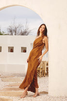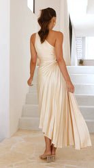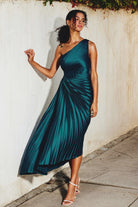 Αυτή η μακριά βραδινή φόρεμα γοητεύει με την τολμηρή της γραμμή με έναν ώμο και το λεπτό πλισέ ύφασμα. Η προσαρμοσμένη της μέση αναδεικνύει τη σιλουέτα με κομψότητα, ενώ η ρευστή της φινέτσα της δίνει μια σοφιστικέ εμφάνιση. Ιδανική για να λάμψετε σε επίσημες εκδηλώσεις ή ειδικές βραδιές.