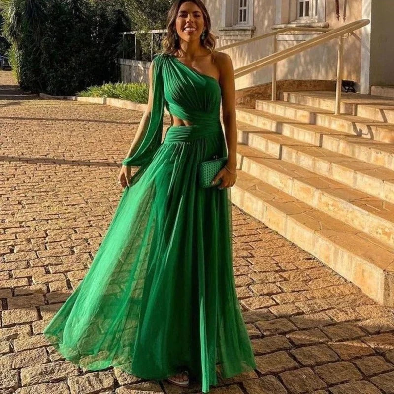 Wafa | Μαξι φόρεμα με πλισέ σχέδιο και ασύμμετρο ώμο – Κομψότητα και Μοντερνισμός