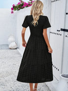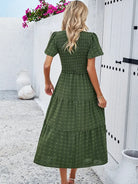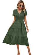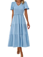 Este vestido bohemio chic de mangas cortas es ideal para un look tanto casual como elegante. Su cintura fruncida resalta la silueta, mientras que su corte fluido asegura una comodidad óptima. Perfecto para el verano, salidas o días soleados.