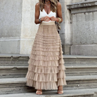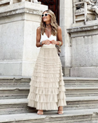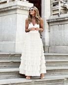 Tämä ilmava, röyhelöillä varustettu hame korostaa siluettia sen ilmavan laskeutumisensa ja imartelevan leikkauksen ansiosta. Sen boheemi chic -tyyli tekee siitä täydellisen valinnan aurinkoisille päiville tai erityisiin tilaisuuksiin. Kevyt ja mukava päällä, se seuraa jokaista askeltasi eleganssilla.