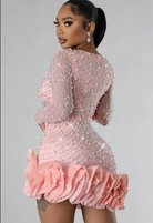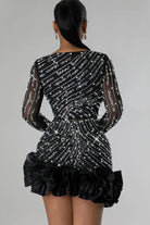 Tämä tiukka mini-mekko on koristeltu kimaltelevilla kristalleilla. Sen syvä V-pääntie ja pitkät, istuvat hihat tarjoavat hienostuneen siluetin. Täydellinen iltoihin ja erityisiin tilaisuuksiin.