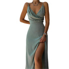 Questo abito da sera con spacco unisce sofisticatezza e stile. La sua silhouette fluida valorizza la figura, mentre lo spacco aggiunge un tocco audace. Perfetto per occasioni speciali, garantisce una presenza notevole.