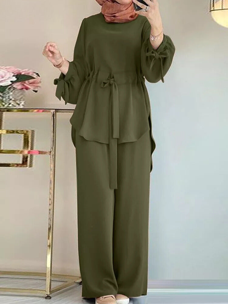多用途で洗練されたこの2ピースセットは、快適さとスタイルを兼ね備えています。ロングチュニックと流れるようなパンツで構成されており、フォーマルな外出にも日常の瞬間にも適しています。
