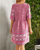 Dit boho-jurk heeft een flatterende V-hals en een elegante print. De vloeiende snit zorgt voor optimaal comfort gedurende de dag. Perfect voor casual gelegenheden of zomerse uitjes.