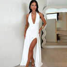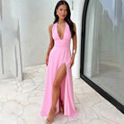 Deze lange jurk heeft een diepe halslijn en een hoge taille, die uw figuur accentueert. De gedurfde split en de delicate strik voegen een vleugje verfijning toe. Perfect voor elegante avonden en speciale gelegenheden.