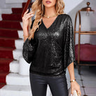Deze blouse benadrukt de silhouette met zijn verfijnde V-hals en zijn elegant vallende uitlopende mouwen. De fonkelende pailletten geven een subtiele glamoureuze toets aan uw look. Ideaal voor avonden of speciale gelegenheden, het combineert een verfijnde stijl met absoluut comfort.