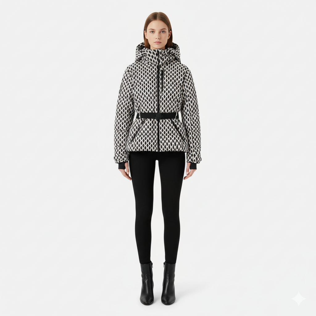 Farah | Zimowa kurtka z paskiem dla kobiet — Graficzna elegancja i nowoczesne ciepło