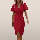 Această rochie tip portefeuille are un decolteu în V flatant și mâneci de fluture aerisite. Talie plisată și fusta încrucișată pun în valoare silueta cu eleganță. Perfectă pentru cine, petreceri sau o seară în oraș.